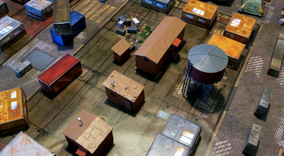 Most of the original PDFs for the table are from Toposolitario.com and the plastic buildings in the center are Plasticville’s Hobo Jungle. The best part is all this easy to assemble terrain is FREE! I just had to print it out and buy a glue stick. Booyah!