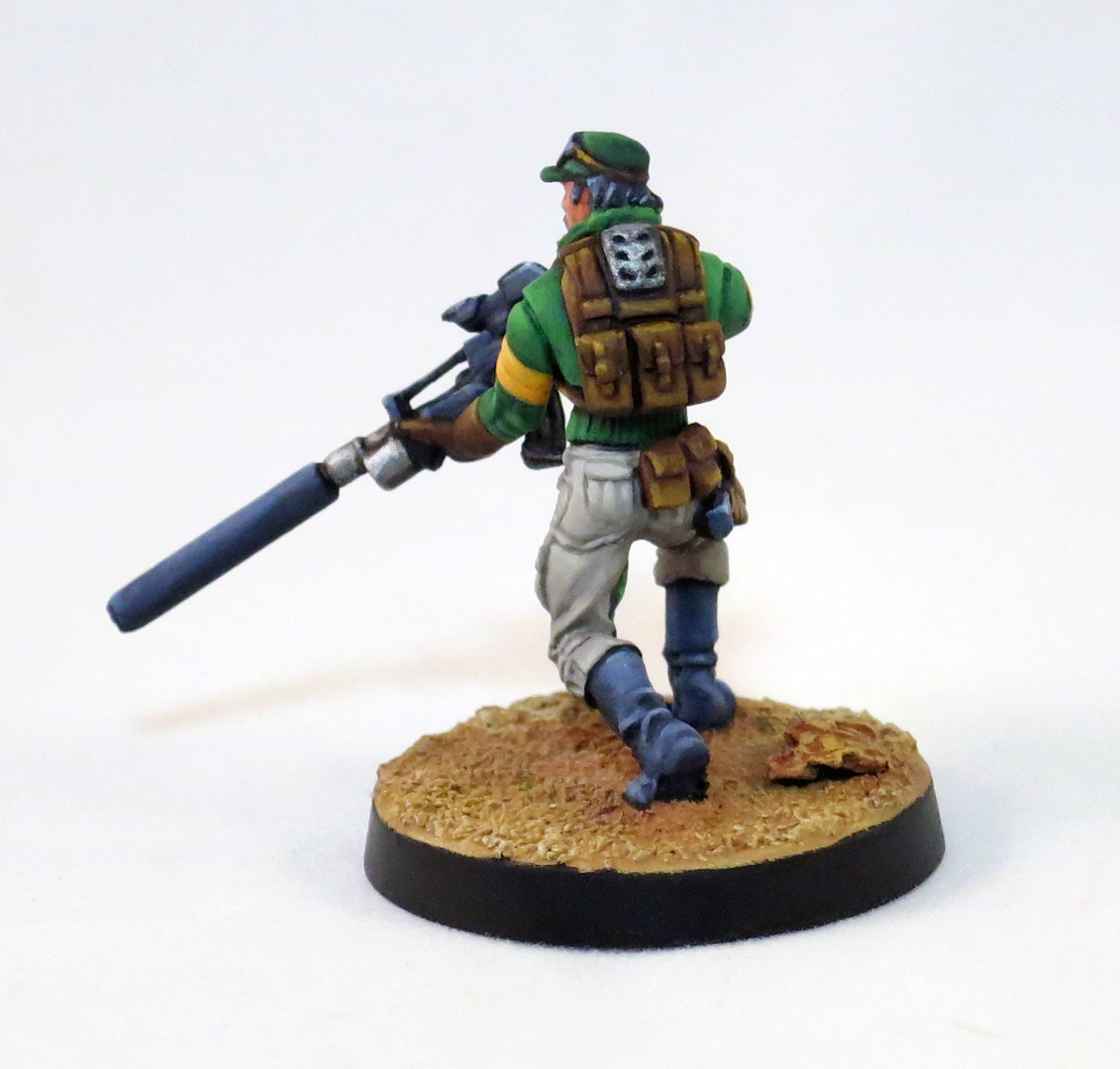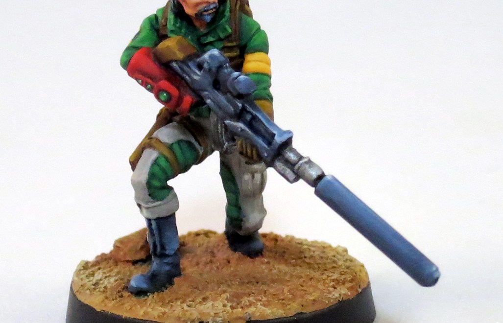 Here’s a sniper I recently finished for my Haqqislam army. I’ve already tried painting this model twice and I was having the hardest time working out the color scheme. I considered scrapping the project and leaving it in hobby limbo; never to feel the unnatural glow of game store, fluorescent lighting.