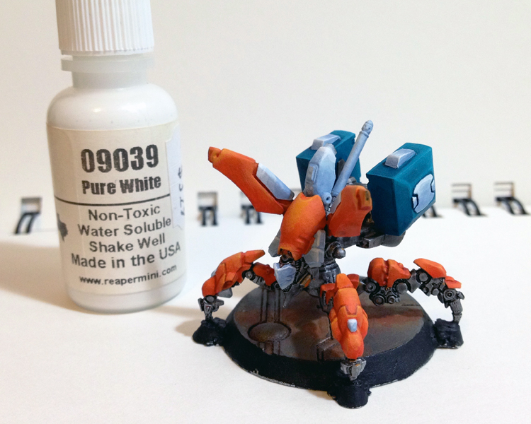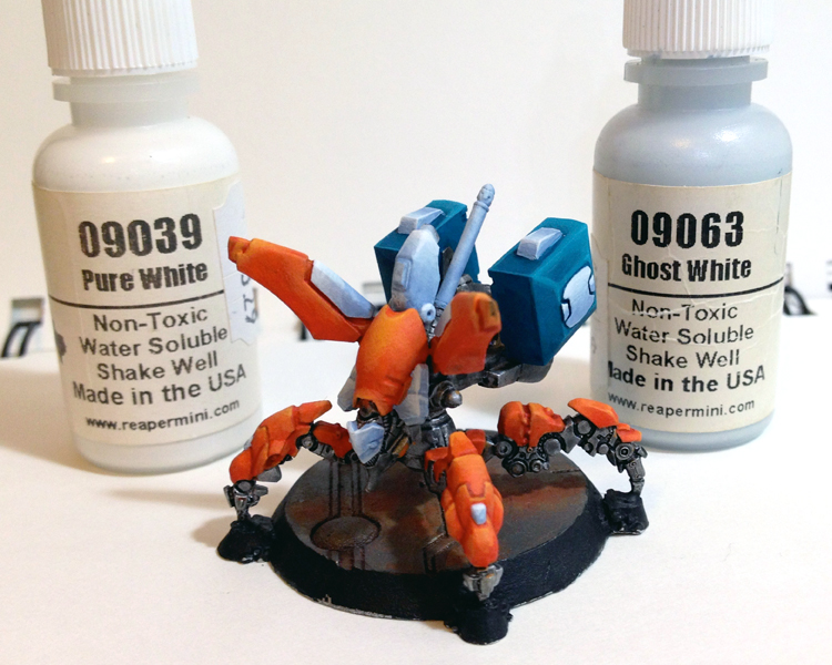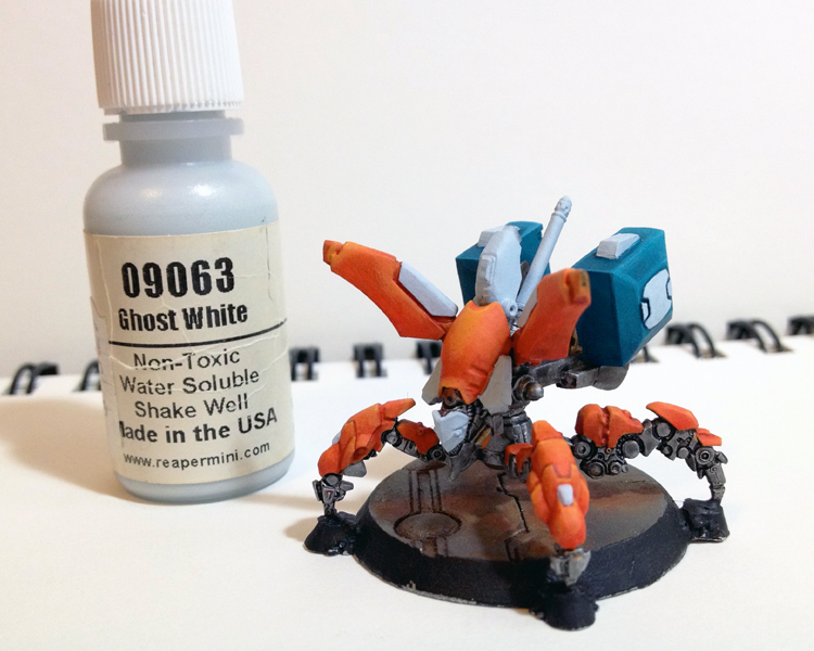 Before base-coating with Ghost White, I gave the EVO a light spray of clear matte varnish. This helps in two ways: 1) It makes it easier to quickly clean off any mistakes without removing the paint underneath, and 2) It prevents the color underneath from bleeding through to the next color. I’ve been trying this a lot recently and I’ve found that it makes base coating from color to color much easier.