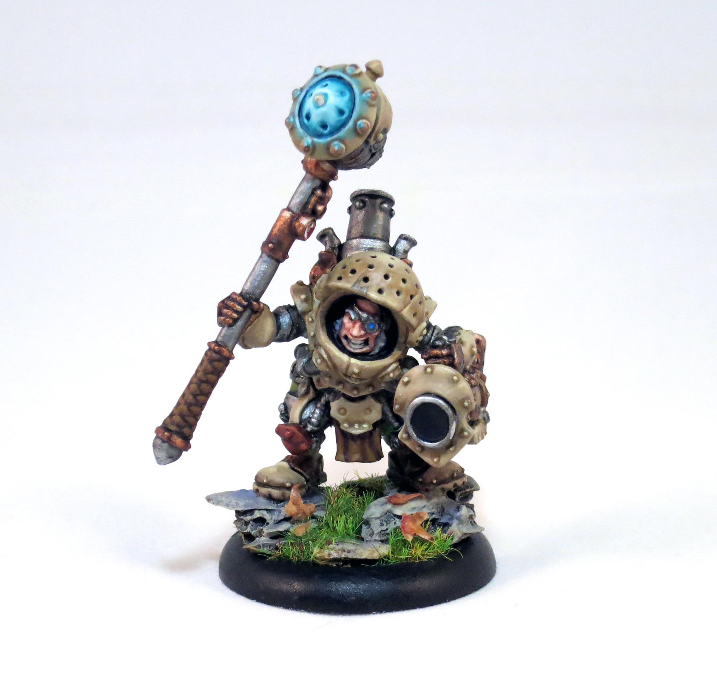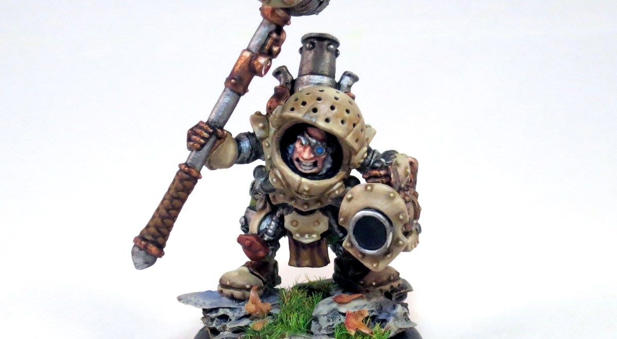Durgen Madhammer is an explosive expert and lover of mayhem. Sure his hammer is impossibly large and his canon would send his little ass flying from the recoil, but damn it he looks so bad ass! One of my favorite things about this miniature is the option to model his blast shield up (as seen here) or down.