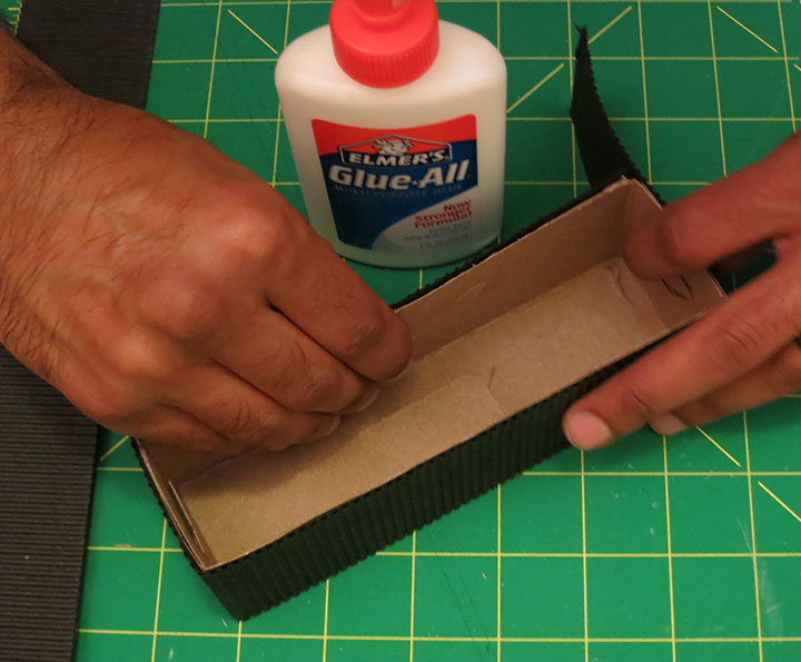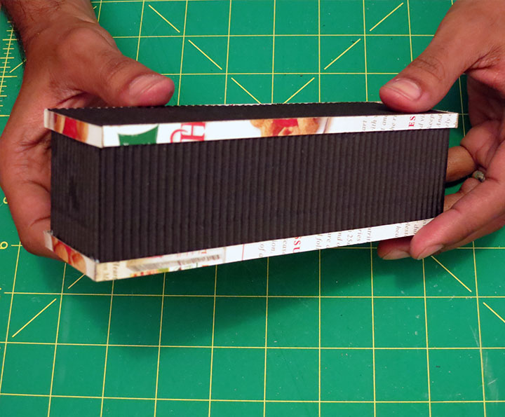 After cutting the paper into 2″ long strips I glue them onto the sides of the crate using paper craft glue. Turn the box top-side down onto your table. This’ll help keep the edges of the paper flush to the top of your crate. Then cut off the excess flap of paper with a scissor.