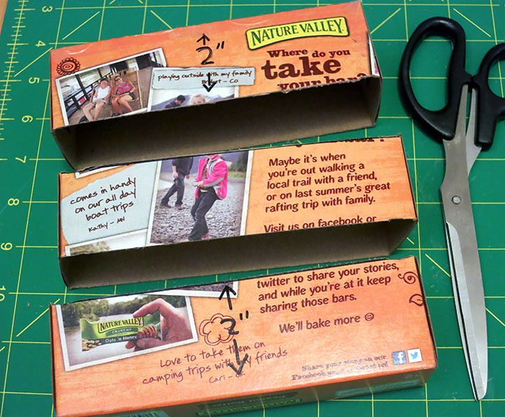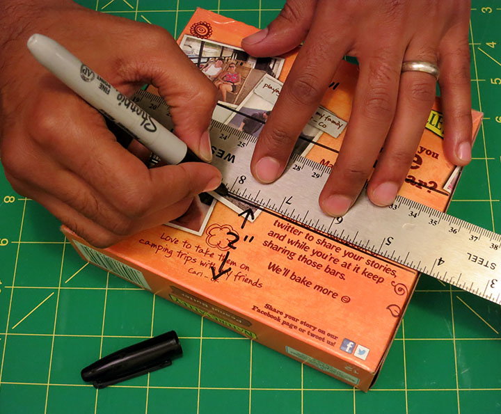 I’m not the most precise person when it comes to building terrain, which is why I like to use already made boxes as my underlying structure. Using this granola box I’ll be able to make two 2″ x 2″ x 6.5″ shipping crates with clean right angles.First, tape the open end closed. I can’t be the only person that destroys the packaging on these boxes when I open them. So that’s what the tape is for. 🙂